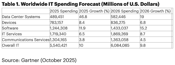 De wereldwijde uitgaven aan informatietechnologie (IT) komen naar verwachting in 2026 uit op $6,08 biljoen, wat neerkomt op een groei van 9,8 procent ten opzichte van 2025. Dat blijkt uit de meest recente prognose van onderzoeksbureau Gartner.