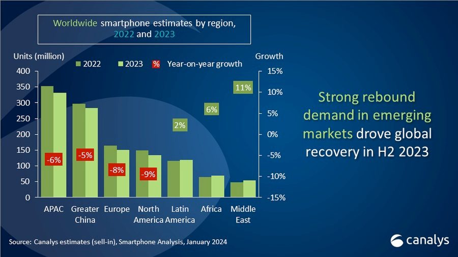 “Het herstel in de opkomende markten leidde tot een herstel in de tweede helft van 2023, waardoor de daling kleiner werd”, aldus Sanyam Chaurasia, Senior Analyst bij Canalys. “Latijns-Amerika, Afrika en het Midden-Oosten profiteerden van extra strategische focus en middelen van leveranciers die een hele reeks massamarktmodellen lanceerden en vertoonden vanaf het derde kwartaal van 2023 een sterk herstelmomentum. Terwijl de macro-economische omstandigheden in de APAC-regio verbeterden, nam de consumentenvraag tegen het einde van het jaar aanzienlijk toe. TRANSSION en Xiaomi hebben geprofiteerd van dit sterke herstel van de massamarkt en hebben in het vierde kwartaal een opmerkelijke groei op jaarbasis gerealiseerd. Volwassen markten, waaronder het vasteland van China, Europa en Noord-Amerika, worden echter nog steeds geconfronteerd met sterke tegenwind als gevolg van gematigde consumentenbestedingen en verminderde kanaalinvesteringen. In 2024 zullen de opkomende markten een strategisch strijdtoneel blijven voor de meeste smartphoneleveranciers die op zoek zijn naar groei.”