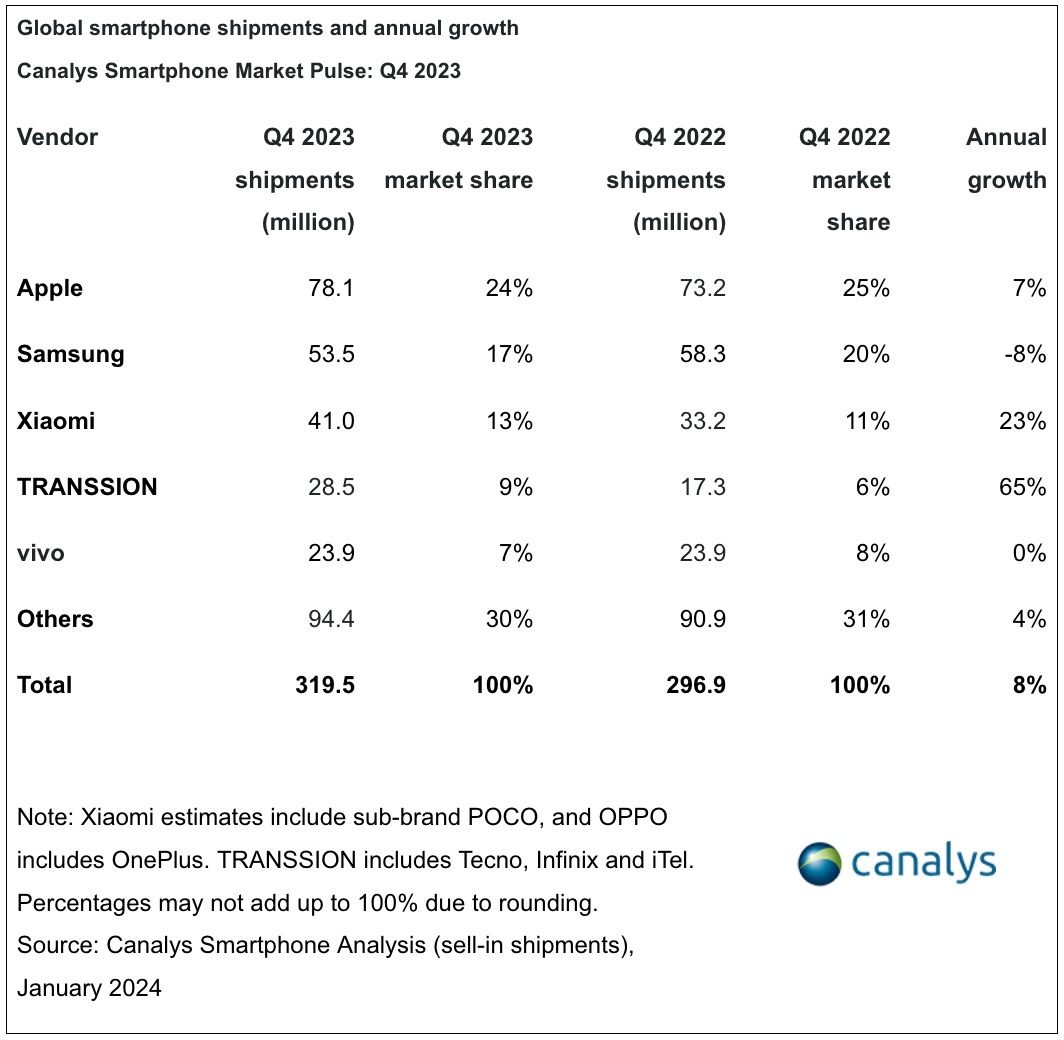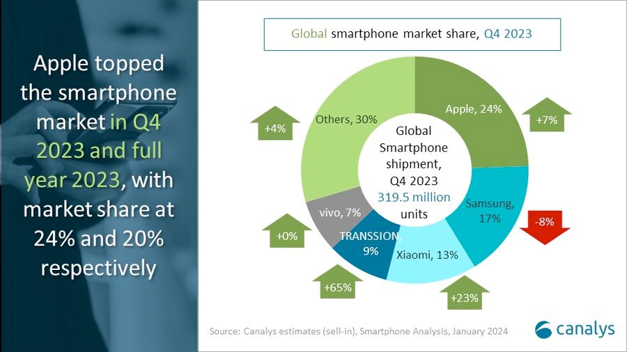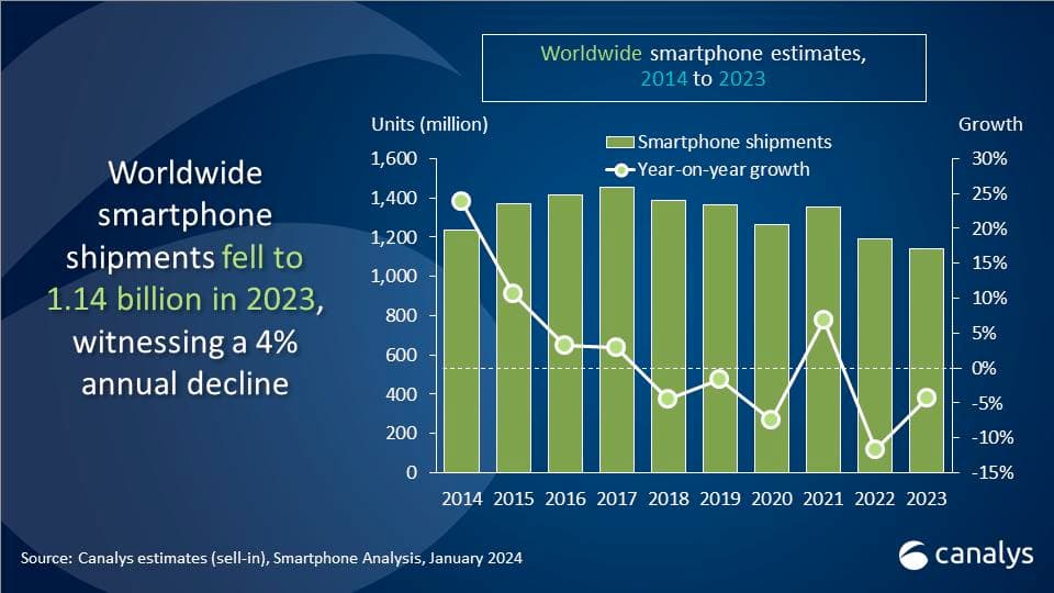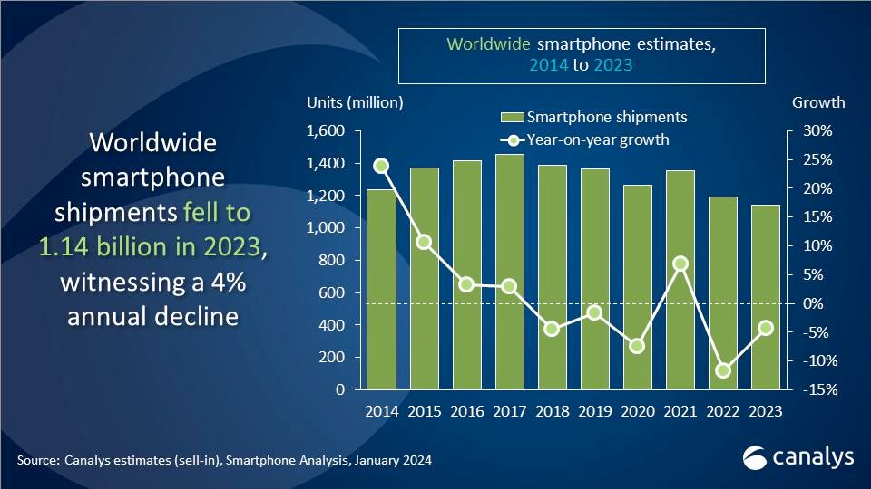 De wereldwijde smartphonemarkt is in het vierde kwartaal van 2023 met 8% op jaarbasis gegroeid tot 319,5 miljoen eenheden. De groei wijst op stabilisatie en herstel van de markt. In het volledig jaar 2023 is de markt met 4% gekrompen ten opzichte van een jaar eerder. In totaal zijn afgelopen jaar 1,14 miljard smartphones verscheept.