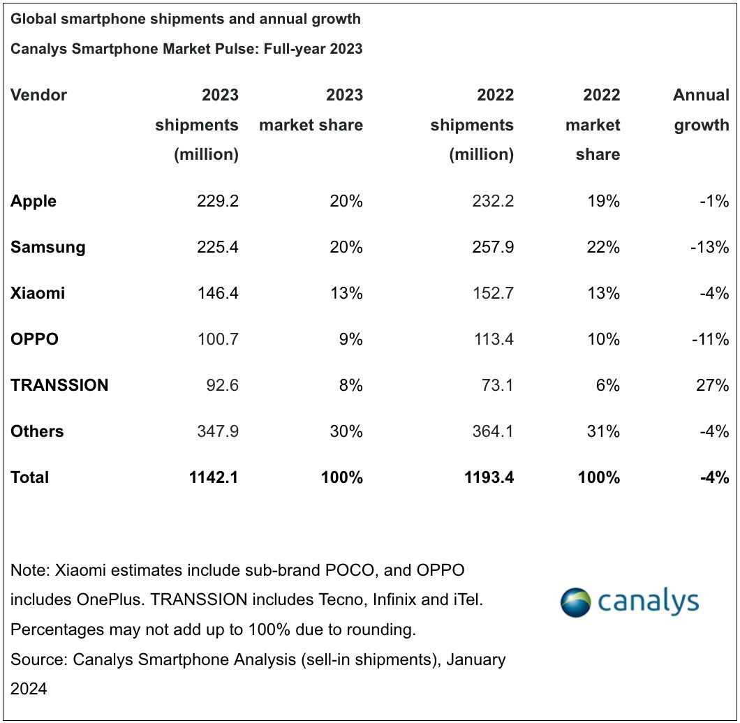 Dit blijkt uit cijfers van marktonderzoeker Canalys. Ondanks de uitdagingen in de kernmarkten is Apple voor het eerst marktleider met een marktaandeel van 20% en 229,2 miljoen verzendingen in 2023. Samsung volgt op de voet met verscheepte 225,4 miljoen eenheden en een marktaandeel van 20%. Xiaomi verstevigt zijn derde positie, met een marktaandeel van 13% en in totaal 146,4 miljoen geleverde smartphones. OPPO en TRANSSION staan op de vierde en vijfde plaats, met respectievelijk 9% en 8% marktaandeel.